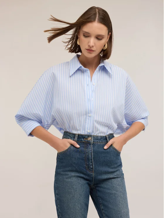 Camicia in popeline di cotone tinto filo a righe; apertura frontale con colletto a vela e bottoni a vista; maniche over con taglio a kimono