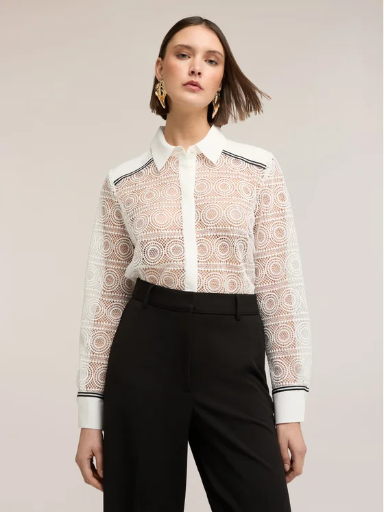 Camicia in pizzo macramé; vestibilità regular, chiusura frontale all'inglese; colletto classico, maniche lunghe con dettaglio a righe sulle spalle e sui polsini.