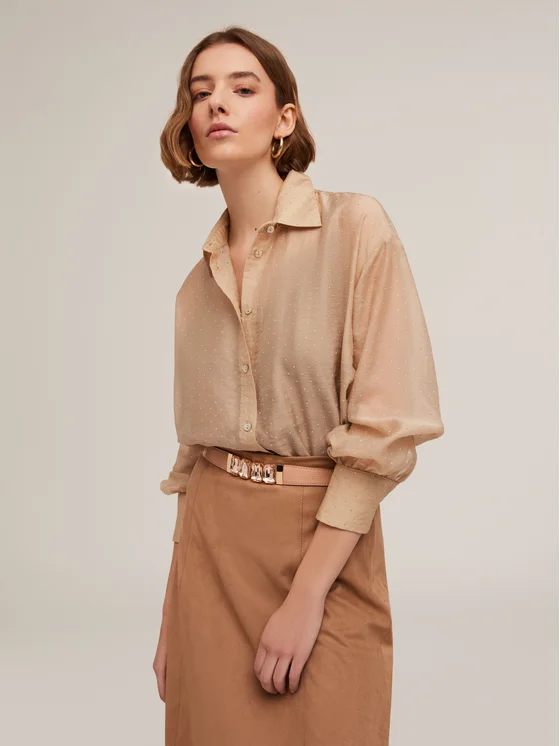 Camicia in tessuto leggero misto lyocell ; apertura anteriore con colletto a vela e bottoni a vista, applicazione frontale di piccole borchie; maniche lunghe con polsino sul fondo