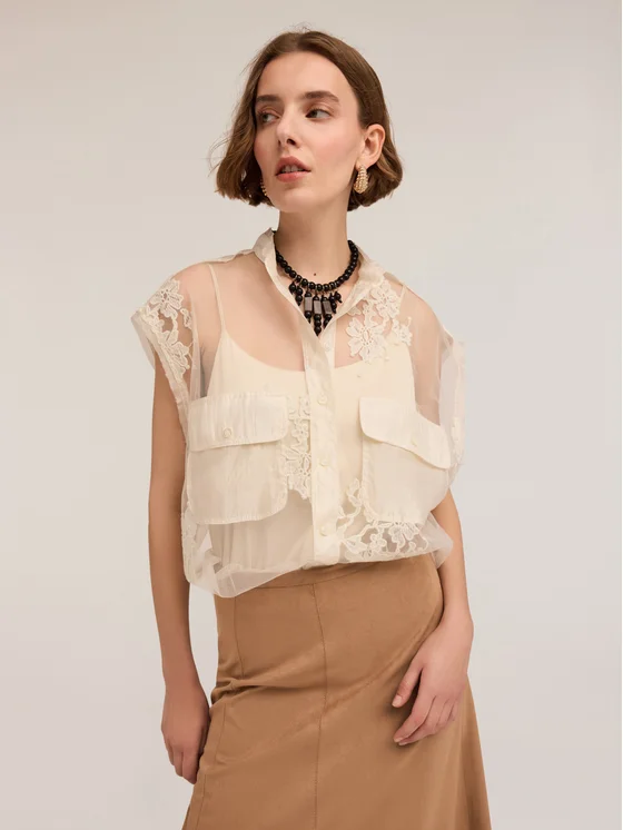 Camicia senza maniche in pizzo; apertura frontale con colletto alla coreana e bottoni a vista; tasche applicate anteriori con patta