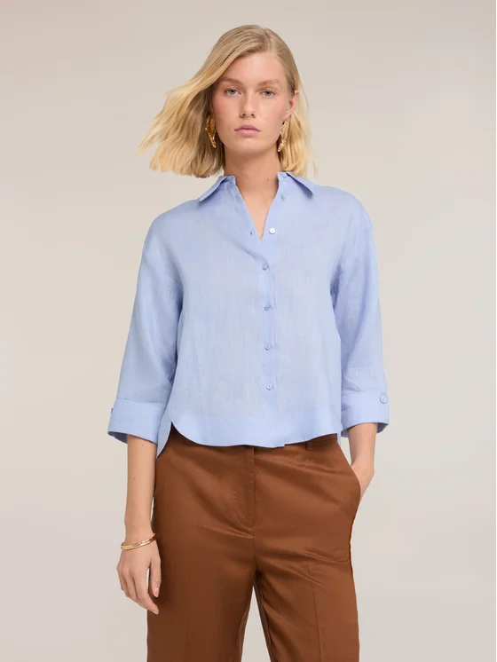 Camicia boxy in tela di lino; chiusura frontale con colletto classico e bottoni a vista; maniche lunghezza tre quarti, fondo stondato con spacchi laterali.