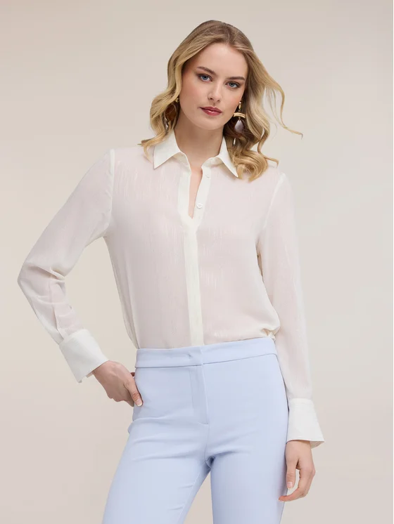 Camicia in chiffon fil coupé; colletto classico con chiusura frontale all'inglese; maniche lunghe con polsino sul fondo.
