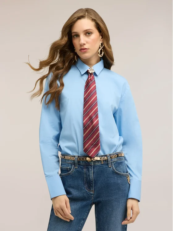 Camicia in popeline misto cotone con cravatta a righe e spilla gioiello; vestibilità regular con chiusura frontale a bottoni, colletto classico; maniche lunghe con polsino e bottoni sul fondo; MADE IN ITALY.