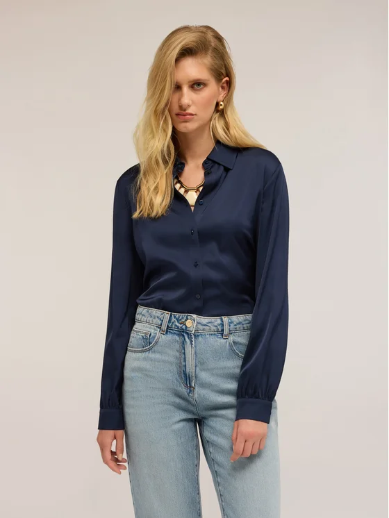 Camicia satin in raso di viscosa tinta unita; chiusura frontale con colletto a vela e bottoni tono su tono; maniche lunghe con polsino sul fondo