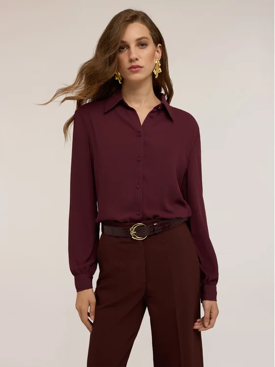 Camicia in tessuto dalla mano crêpe; apertura frontale con colletto classico e bottoni foderati a vista; maniche lunghe con polsino sul fondo