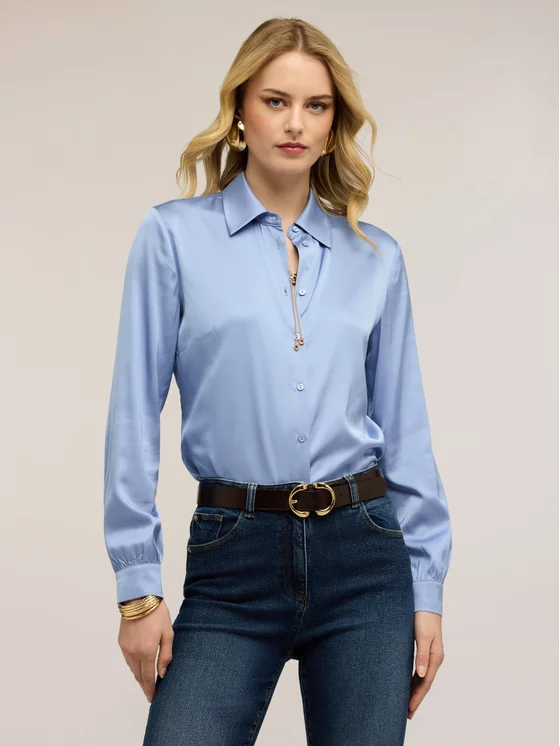 Camicia in raso di viscosa; vestibilità regular con chiusura frontale a bottoni; colletto classico e maniche lunghe.