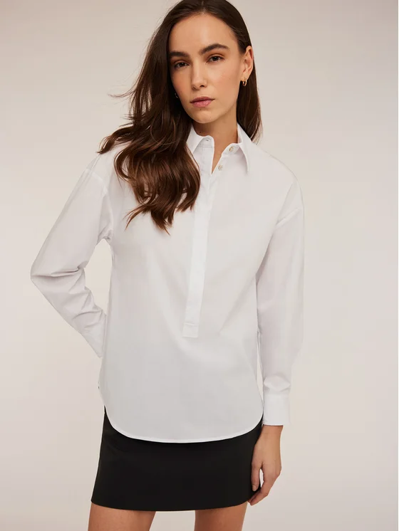 Blusa in popeline misto cotone tinta unita; colletto a vela e abbottonatura all'inglese; maniche lunghe con polsino sul fondo