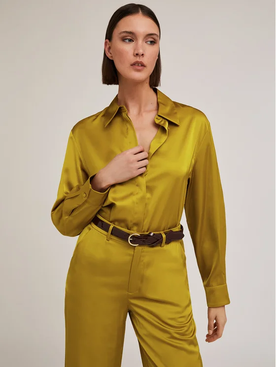 Camicia satin in raso misto viscosa; chiusura frontale con colletto a vela e abbottonatura all'inglese; maniche lunghe con polsino sul fondo, piega a cannoncino posteriore
