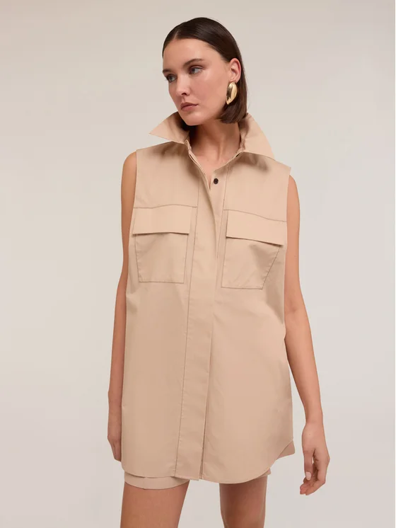 Camicia in popeline di cotone; modello over senza maniche con colletto a vela e abbottonatura all'inglese; tasche anteriori con patta applicate, motivo bottone sul fianco che regola l'ampiezza del capo