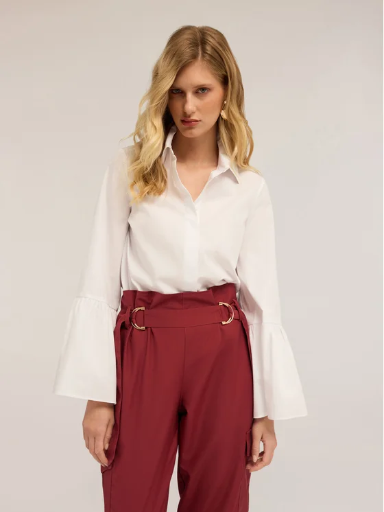 Camicia in popeline di cotone; colletto a vela e abbottonatura all'inglese; maniche lunghe con inserto a campana sul fondo