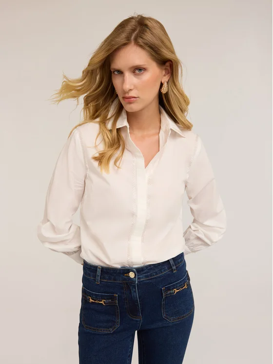 Camicia in popeline di cotone tinta unita; colletto a vela e abbottonatura all'inglese; maniche lunghe con polsino sul fondo e leggera arricciatura