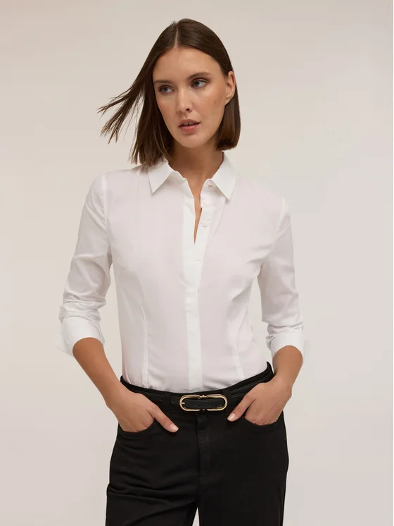 Camicia in popeline misto cotone stretch; colletto a vela e abbottonatura all'inglese; manica lunga con polsino