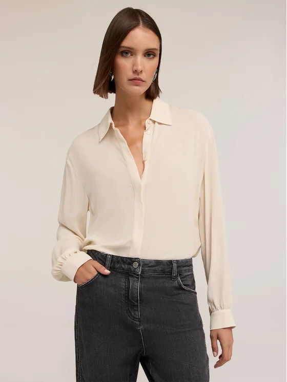 Camicia fluida in tessuto dalla mano crêpe; apertura frontale con colletto a vela e bottoni nascosti, motivo abbottonatura posteriore; maniche lunghe con leggera arricciatura sul fondo e polsino