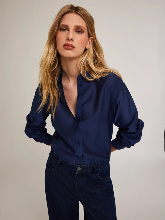 Camicia misto lyocell tinta unita; apertura frontale con colletto a vela e bottoni a vista; maniche lunghe con leggera arricciatura sul fondo e polsino