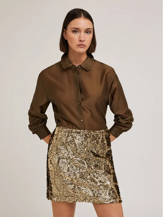 Camicia misto lyocell tinta unita; apertura frontale con colletto a vela e bottoni a vista; maniche lunghe con leggera arricciatura sul fondo e polsino