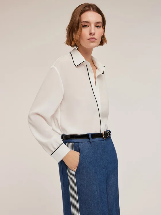 Camicia in georgette tinta unita; colletto a vela e abbottonatura all'inglese con piping in contrasto colore; motivo spacco nel centro dietro, maniche lunghe con polsino sul fondo