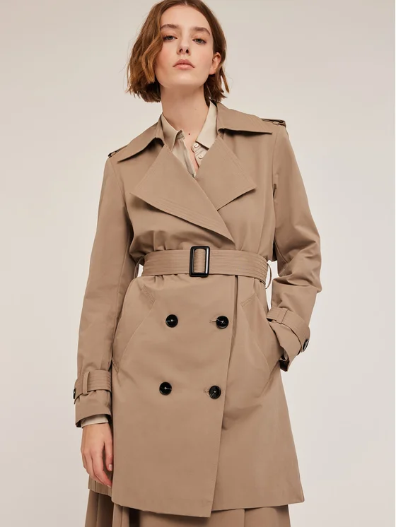 Trench in tessuto tecnico misto cotone con fodera interna; chiusura doppiopetto con bottoni a vista, patta frangivento posteriore; maniche lunghe con cinturino al fondo, cintura in vita tono su tono, tasche frontali