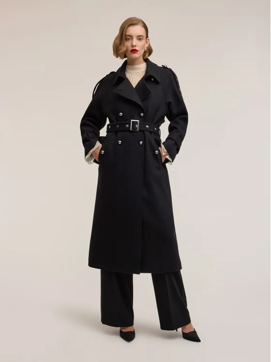 Trench in panno misto lana; modello lungo con vestibilità regular e chiusura doppiopetto con bottoni; maniche lunghe con applicazioni metalliche, cintura in vita con fibbia.