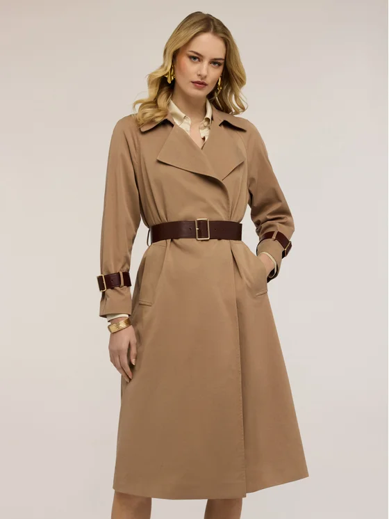 Trench in drill misto cotone lyocell; modello lungo con vestibilità regular e chiusura con cintura; colletto classico con revers, maniche lunghe con cinturini sul fondo.