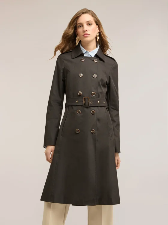 Trench in drill misto cotone con fodera interna; colletto a revers e chiusura doppiopetto con bottoni a vista; maniche lunghe, cinture in vita interscambiabili a righe e in tono.
