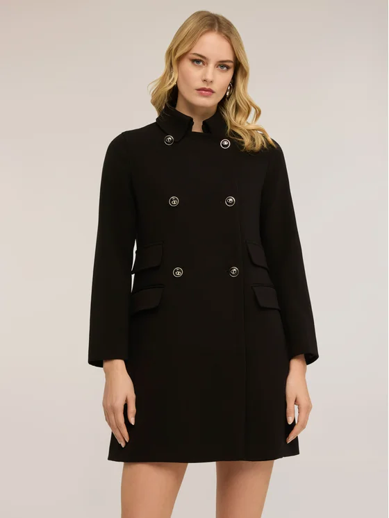 Cappotto in tessuto compatto di poliviscosa; modello lungo con vestibilità regular e chiusura doppiopetto con bottoni a vista; colletto classico, quattro tasche applicate con patta, maniche lunghe.