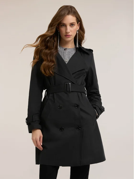 Trench in tessuto tecnico misto cotone con fodera interna; chiusura doppiopetto con bottoni a vista, patta frangivento posteriore; maniche lunghe con cinturino al fondo, cintura in vita tono su tono, tasche frontali