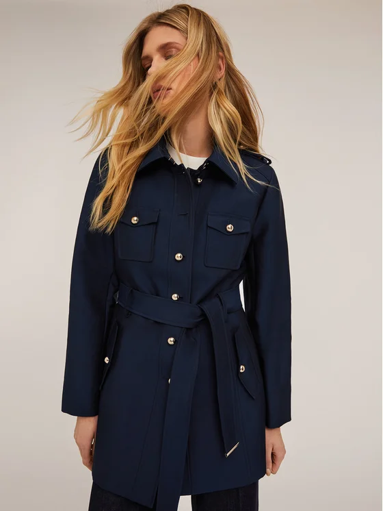 Trench slim in tessuto compatto misto cotone effetto satin; apertura frontale con colletto a vela e abbottonatura monopetto, cintura in vita tono su tono; maniche lunghe, tasche anteriori applicate con patta