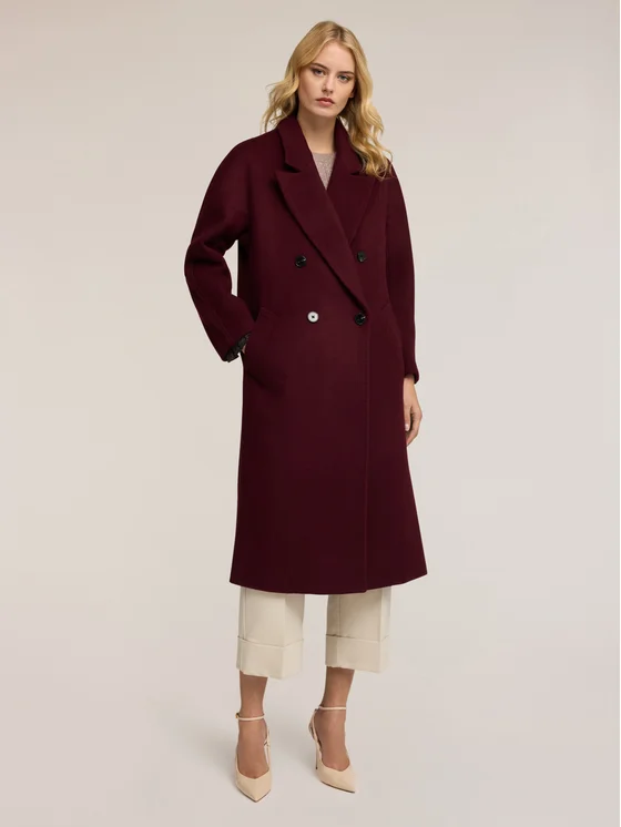 Cappotto lungo in drap misto lana; modello doppiopetto con vestibilità regular, chiusura con cintura in vita; maniche lunghe, foderato internamente.