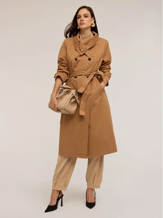 Trench in tessuto tecnico misto cotone con fodera interna; collo alto, chiusura doppiopetto con bottoni a vista, spacco posteriore nel centro dietro; maniche lunghe con cinturino al fondo, cintura in vita tono su tono, tasche frontali