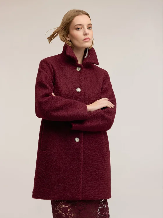 Cappotto in panno bouclé; lunghezza media, chiusura monopetto con bottoni e colletto a vela; maniche lunghe, tasche anteriori verticali.