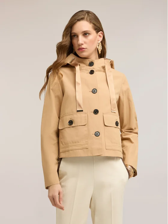 Parka corto in tessuto compatto misto cotone con fodera interna; vestibilità regular, chiusura frontale con bottoni a vista, cappuccio con coulisse regolabile e fibbie metalliche; tasche anteriori applicate con patta e bottone, maniche lunghe, zip laterali.
