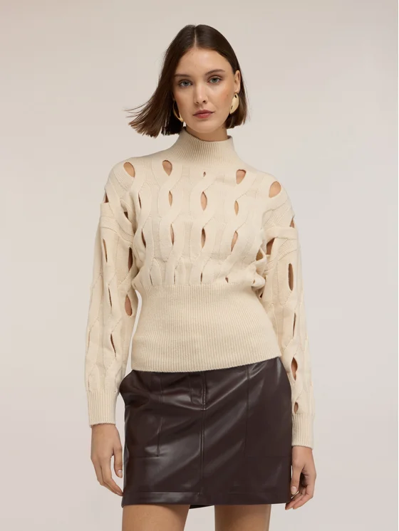 Maglia traforata in filato misto lana con lavorazione a trecce; modello regular con collo alto a dolcevita; maniche lunghe, baschina alta in vita a coste.