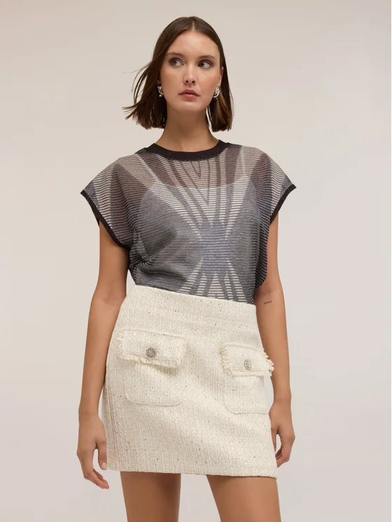 Maglia in filato misto viscosa fantasia geometrica con top interno; scollatura tonda con bordo tinta unita; maniche corte con taglio a kimono