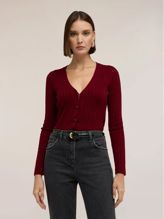 Cardigan a coste in maglia misto lana tinta unita; vestibilità slim con chiusura frontale a bottoni gioiello; scollatura a "V", maniche lunghe.