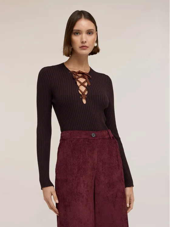 Maglia a coste in filato misto viscosa; vestibilità slim con scollatura a v e motivo a lacci; maniche lunghe.; MADE IN ITALY.