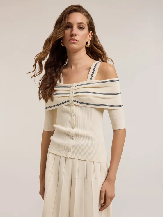 Top in maglia in viscosa tecnica con dettagli a righe; scollatura off-shoulder con spalline e maniche corte; apertura frontale con bottoni a vista; Le fibre LENZING™ ECOVERO™ derivano da fonti di legno controllate o certificate. Le fibre LENZING™ ECOVERO™ supportano la morbidezza e il drappeggio naturali.