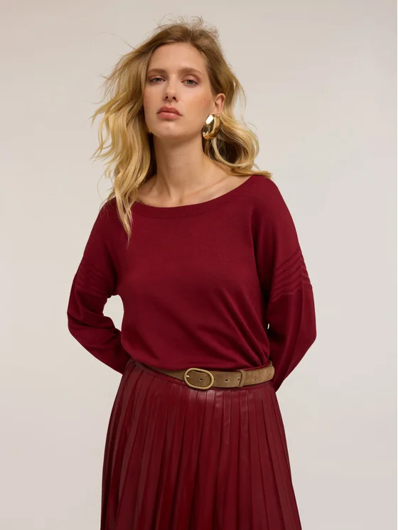 Maglia over in filato misto viscosa; scollatura a barca frontale; maniche lunghe con dettaglio a coste