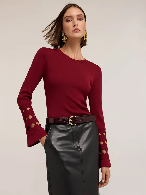 Maglia in filato misto viscosa; scollatura tonda; maniche lunghe svasate con motivo cut-out sagomato