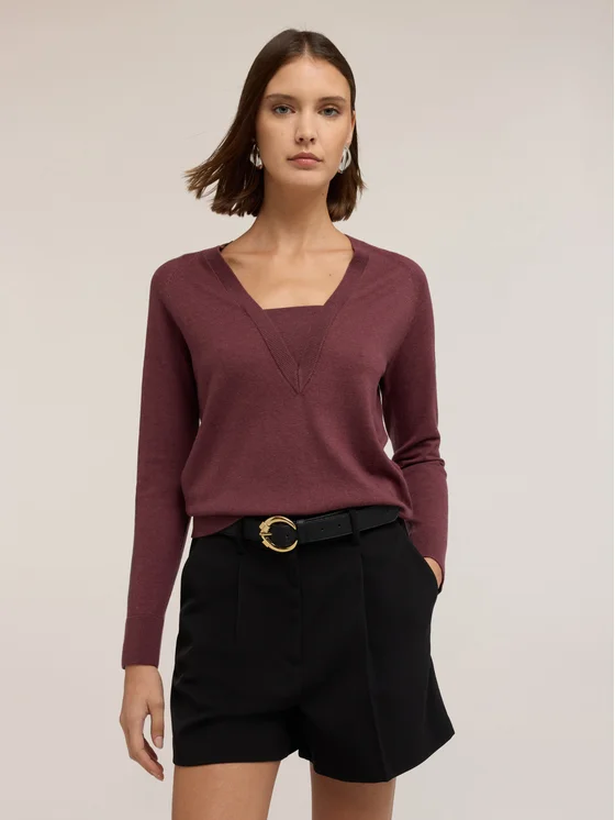 Maglia in filato misto seta; scollatura a "V" frontale; maniche lunghe con bordo in contrasto colore.