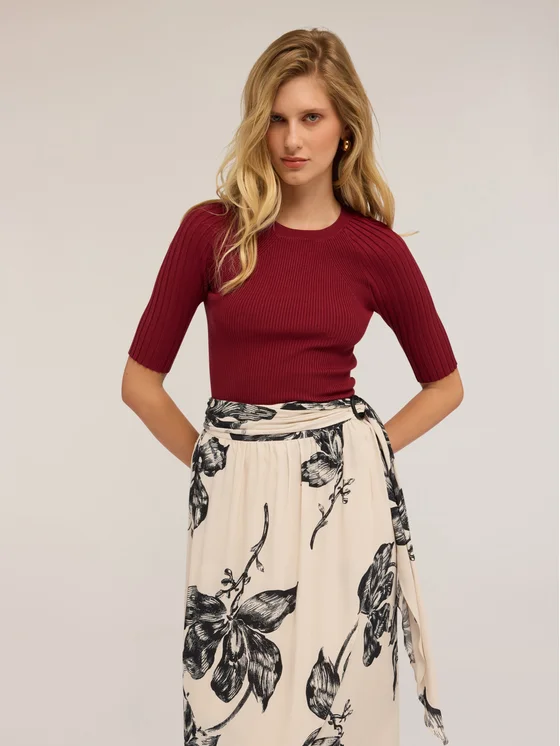 Maglia realizzata in filato di viscosa comfort; lavorazione a coste, più larghe sulle maniche; scollatura tonda e maniche corte