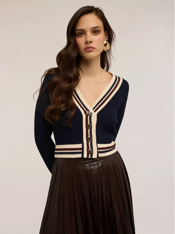 Cardigan corto in filato misto viscosa con lavorazione a punto mosso, bordi fantasia a righe; apertura frontale con scollatura a v e bottoni a vista; maniche lunghe