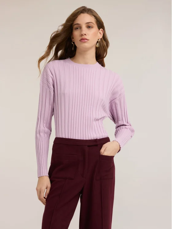 Maglia con lavorazione a coste; vestibilità slim; scollatura girocollo, maniche lunghe.