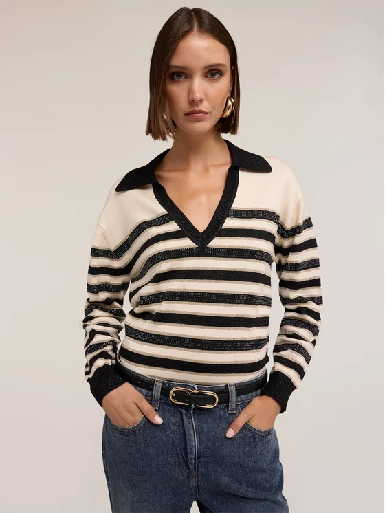 Maglia in filato misto viscosa lurex; fantasia a righe con applicazione di micro strass; scollatura frontale a v con colletto tinta unita, maniche lunghe