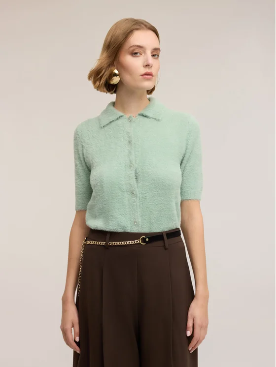 Cardigan in filato misto viscosa; modello corto con vestibilità regular e colletto; maniche tre quarti con chiusura frontale a bottoni.