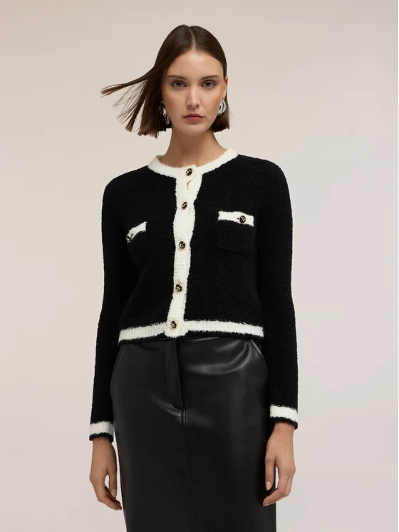 Cardigan in maglia misto lana; modello corto con chiusura a bottoni a vista; scollatura girocollo, maniche lunghe, bordi in contrasto colore.