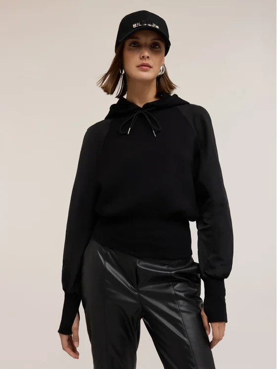 Felpa chiusa con inserti in taffetà; vestibilità regular con cappuccio e lacci di chiusura; maniche lunghe raglan, polsini e fascia in vita a costine.