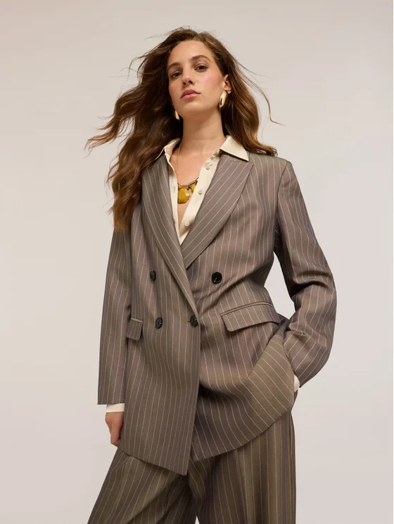 Blazer realizzato in fluido tessuto a lavorazione gessata; linea dritta; chiusura a doppiopetto, tasche a patta davanti, fodera interna; possibilità di abbinarlo ai pantaloni coordinati