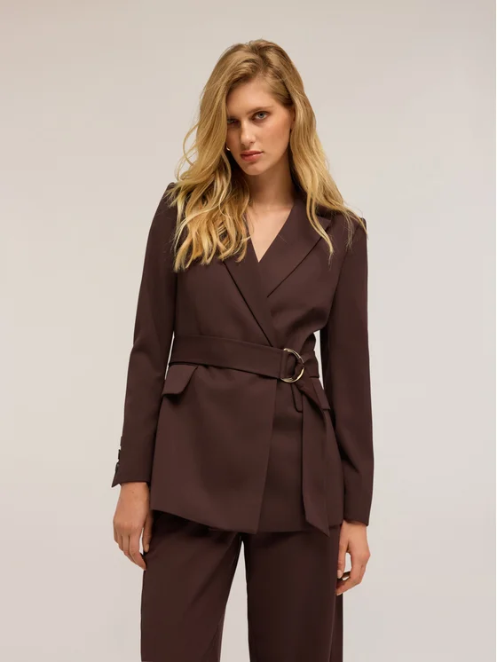 Giacca in tessuto misto viscosa con fodera interna; colletto a revers e abbottonatura a doppiopetto con bottoni, cintura in vita tono su tono; tasche anteriori con patta, maniche lunghe