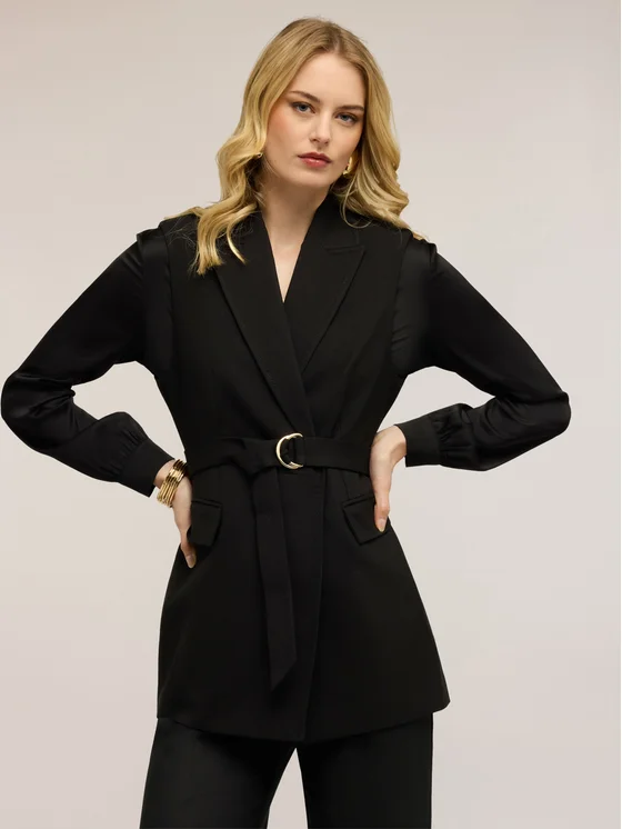 Gilet lungo in tessuto armaturato di poliviscosa; colletto a lancia con impunture a sellaio, chiusura con cintura; design doppiopetto con tasche applicate.