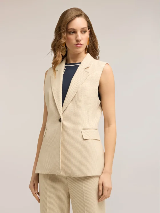 Gilet in tessuto tinto filo a righe; modello di lunghezza media con fodera e chiusura frontale con bottone; colletto a revers e tasche applicate frontali.